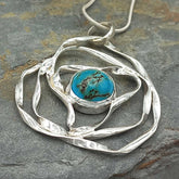 An elegant turquoise and sterling silver pendant, with optional chain. A satisfying curvy Turquoise stone gorgeously sculptured into a cone, charmingly drops from a sterling silver bail embellished with a twisting strand design. A truly beautiful handmade and unusual pendant. Pendant is 32mm from top...- £45.00